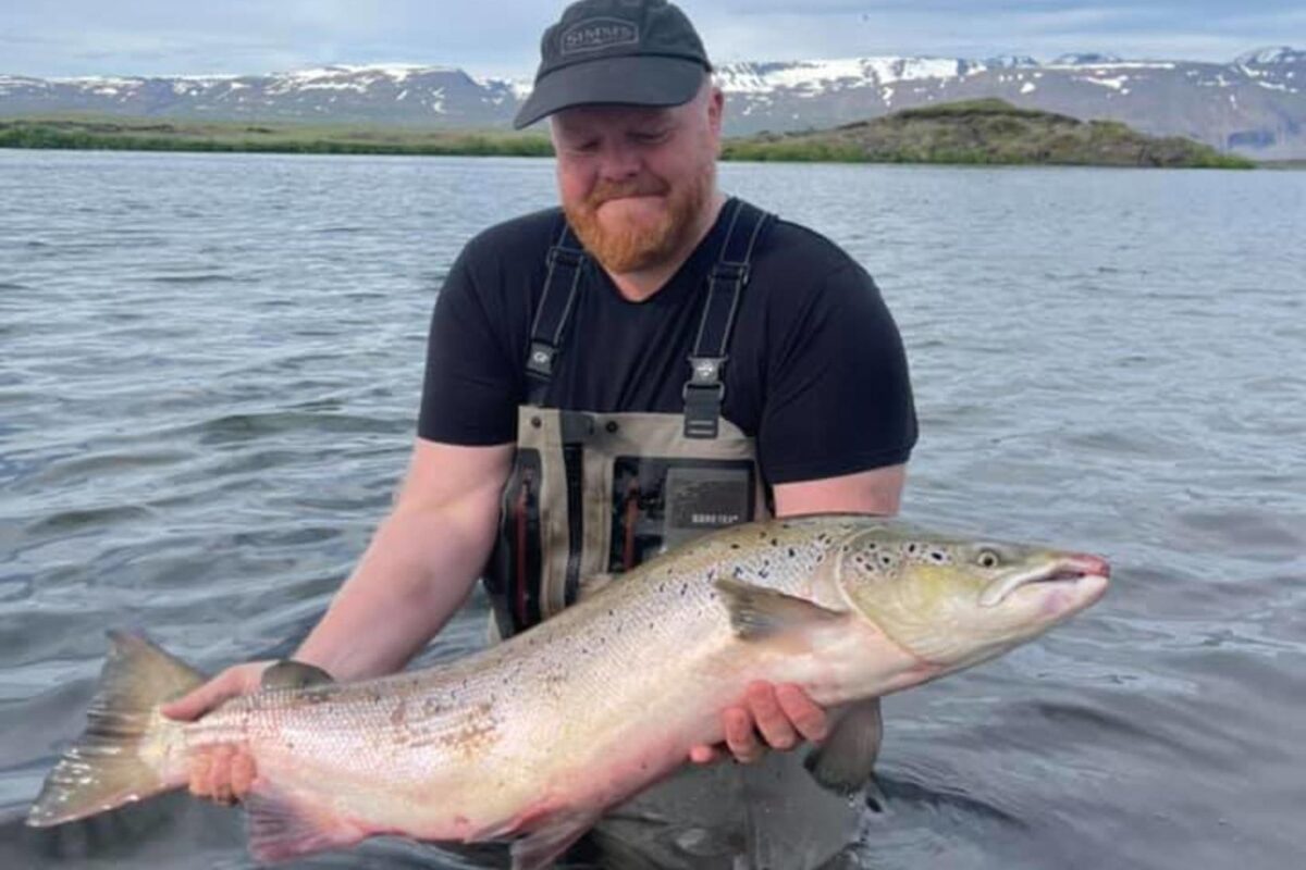 Rob Williams með 103 sentímetra hæng úr Dalsárósi í Víðidalsá, sem hann veiddi 17. september í ár. Víðidalsá hefur gefið fjórtán slíka síðustu þrjú árin. Ljósmynd/NFJ