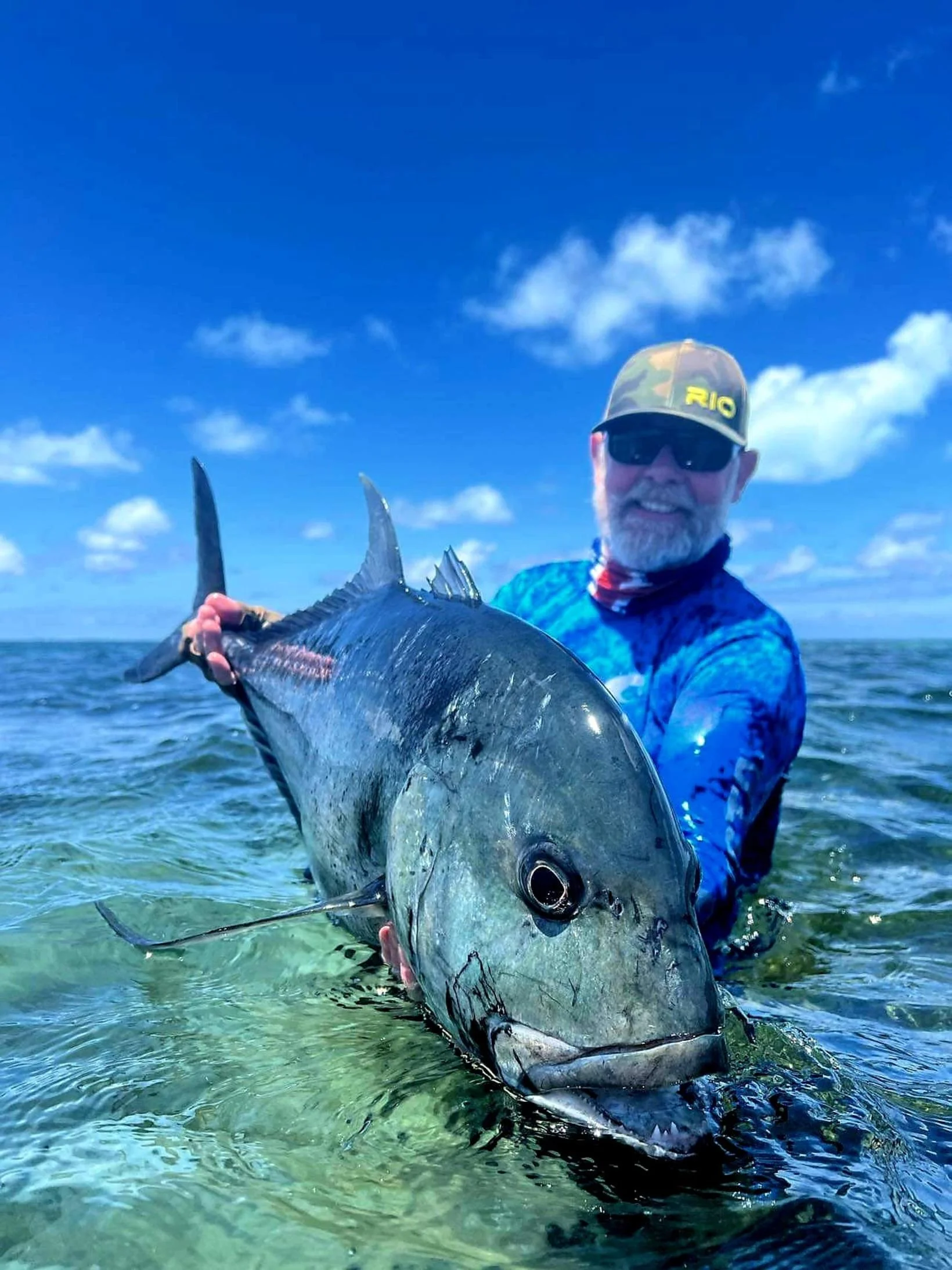 „Um leið og fiskurinn var laus var hann rokinn einhverja 150 metra og festi línuna aftur í kóröllum. Við æddum á eftir honum á bátnum og vorum aftur viss um að fiskurinn væri farinn en þegar okkur tókst að losa línuna úr kórölunum tók hann aftur 100 metra roku. Þegar loksins tókst að ná þessum magnaða fiski upp að bátnum og háfa hann datt flugan úr kjafti hans og var krókurinn nánast orðinn uppréttur en flugur hnýttar fyrir þessa fiska eru aðeins hnýttar á króka af sterkustu gerð. Þess má geta að agnhald allra króka er klemmt aftur svo þeir skaði ekki fisk þegar sleppt er. Þess vegna er gríðarlega mikilvægt að aldrei komi slaki á línu svo ekki losni úr fiski.“