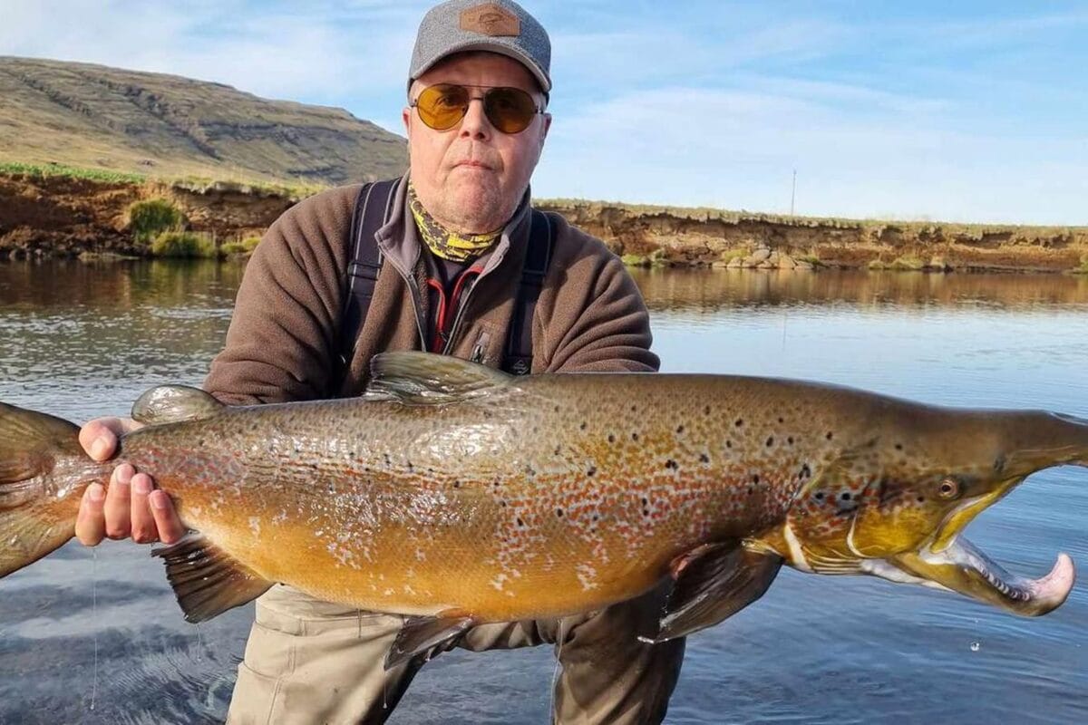 Allt í einu heyrðu égsplass fyrir ofan mig og sá hvar fiskur hafði stokkið. Ég tók stöngina, tíu feta sjöu með flotlínu. Á stönginni var afar netturhexacon rauðurFrances. Ég tók nokkur köst og þá tók hann. Ég var einn og þetta var fullorðin glíma. Svo stökk hann og fljótlega stekkur hann aftur. Þá sá ég vel hversu mikill fiskur þetta var,“ sagði Jón í samtali við Sporðaköst skömmu eftir að hann var búinn að landa þessum glæsilega hæng.