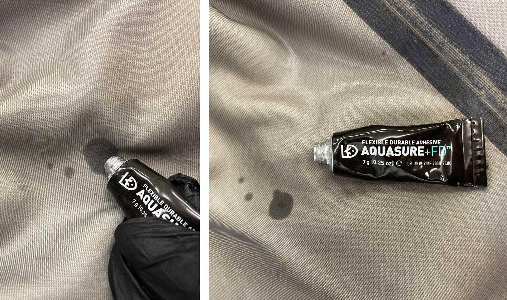Gert við göt á vöðlum. Aquasure límið er áreiðanlegt og endingargott.