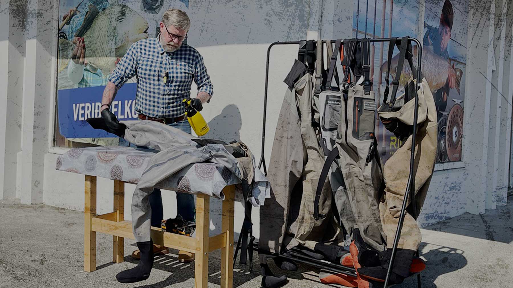 Þegar vöðlurnar eru þurrar er spreyjað yfir þær með Revivex Durable Water Repellent en það eykur vatnsheldni og kemur í veg fyrir að óhreinindi safnist í efnið í vöðlunum.