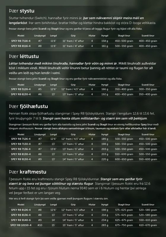 Sage Spey R8 tvíhendurnar eru ekki allar byggðar með sömu virkni, heldur eru þær hannaðar fyrir mismunandi aðstæður.