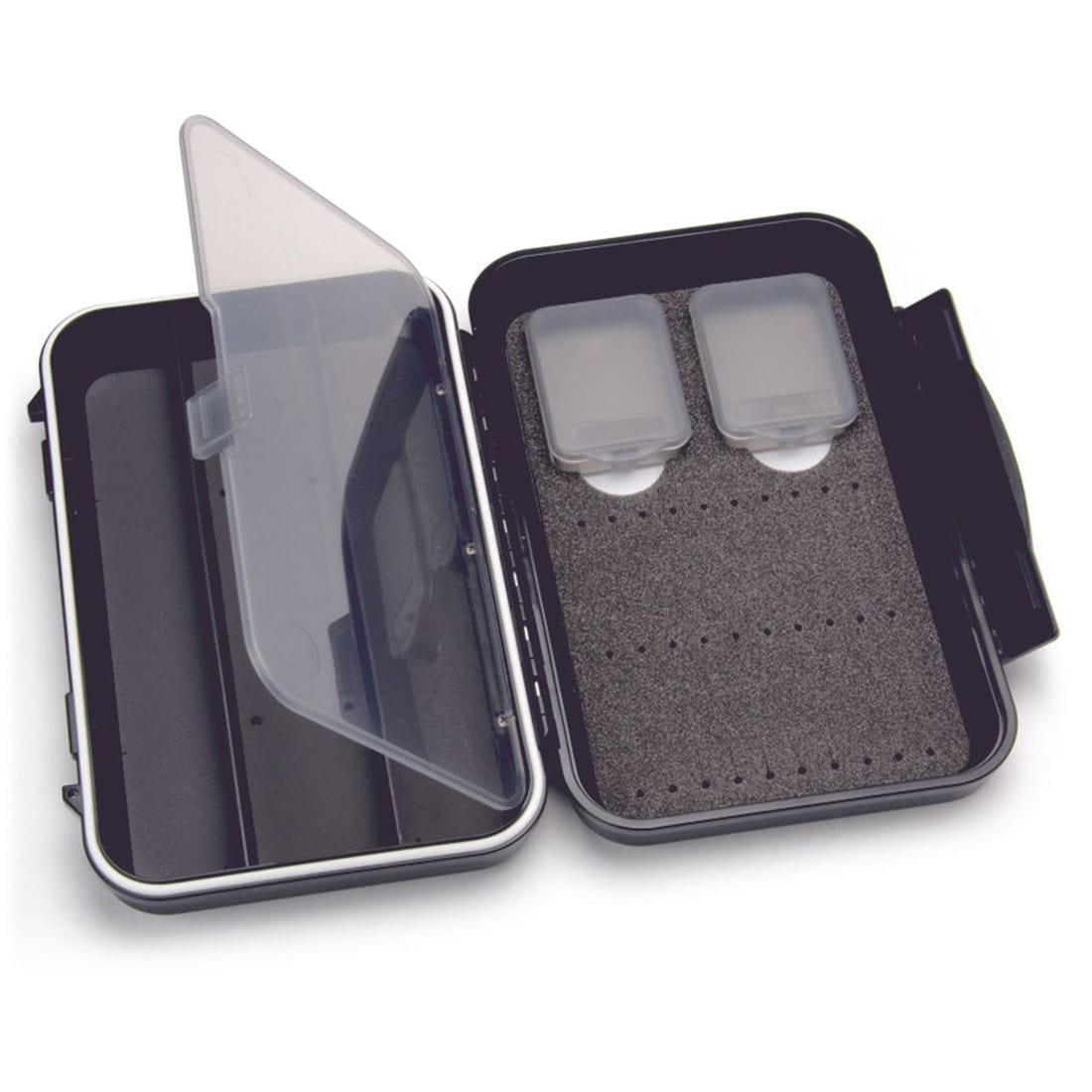 3 hólf í annarri hliðinni og svampur í hinni fyrir króka eða flugur.
