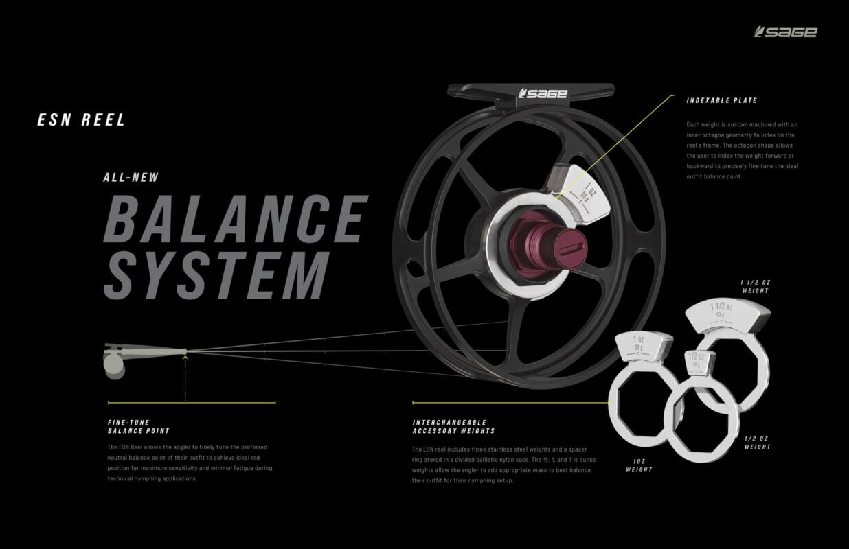Packed with a suite of specialty features, the ESN reel is designed specifically with the Euro-Nymph angler in mind and is fine tuned to the nuances of the application. Built around a super thin and large diameter arbor, this design now makes it easier to get fish on the reel quickly, minimizing the need to guide line onto the spool with your finger, all while providing consistent drag output. A unique balance system allows anglers to assemble and fine-tune a set of weights, so the ESN reel can perfectly balance any Euro Nymphing (or standard) rod. Add in a full frame that prevents fine leaders and lines from sneaking through the frame, and a sealed carbon drag system that provides a smooth uptake – leaving you with the ultimate fish-catching machine.