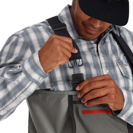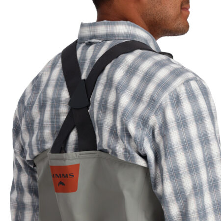 - Stretch elastic suspenders with Simms custom opposing male and female buckles for easy waist-high conversion